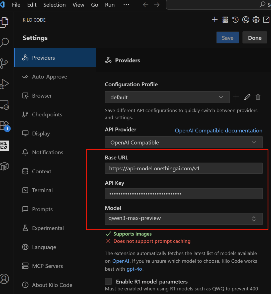 2)选择 Kilo Code 中的 Use my own API key,复制网心算力云模型广场中 Qwen3-Max-Preview 模型API相关信息 以及 步骤1 获取的 API key,黏贴至Kilo Code相关选项中: