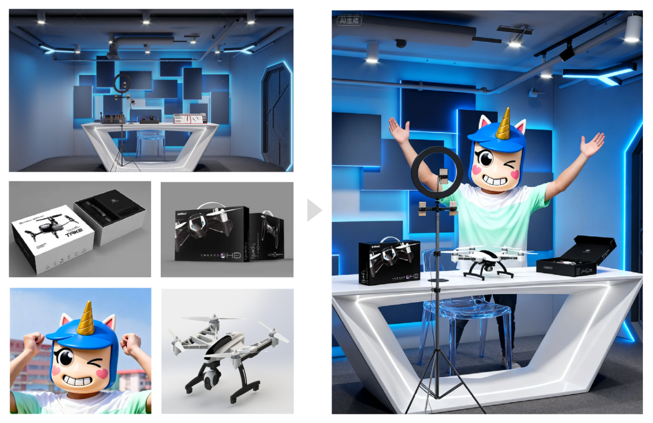 整个过程不需要复杂描述,既有审美,也有结构。实测下来,完全足够当作室内提案草图了。再看看直播场景的搭建能力,通过直播间背景、无人机产品和包装图,看看 Seedream 4.0 能不能把这些碎片拼成一张完整、有氛围的带货图。