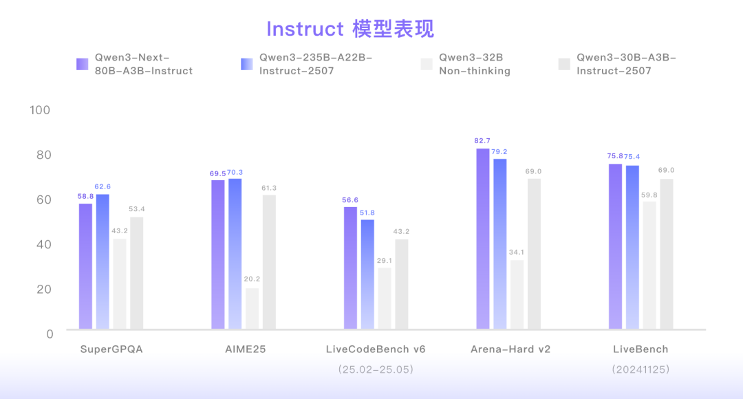基于Qwen3新一代思考开源模型,相较上一版本Qwen3-235B-A22B-Thinking-2507指令遵循能力有提升、模型总结回复更加精简。其在数学推理评测中以 87.8 分全面超越了 Gemini2.5-Flash-Thinking,而达到如此高水平的模型性能,仅需激活 Qwen3-Next 总参数 80B 中的 3B。