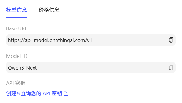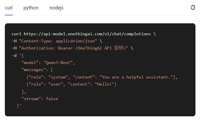 步骤三:OneThingAI平台提供curl、Python、Node.js三种技术方案,以便快速接入模型Qwen3-Next,满足多样化开发场景及开发者使用习惯。
