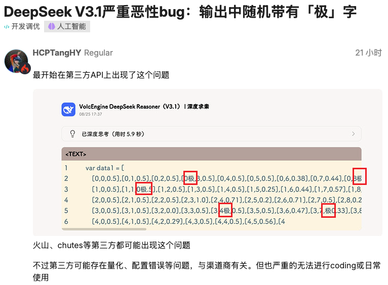 此前,部分网友在使用 DeepSeek-V3.1 生成文本时,模型会随机插入“极”(简体/繁体)、“extreme”等无关词汇。例如,在整理物理试卷、生成代码时,输出内容中会莫名出现“极”字,导致结果错误或无法使用。