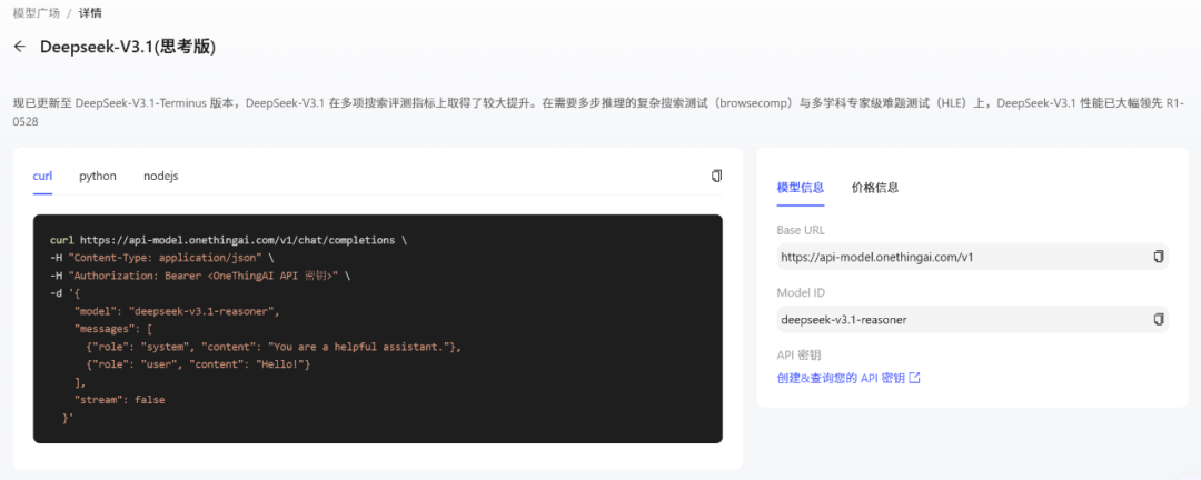 步骤三:OneThingAI平台提供curl、Python、Node.js三种技术方案,以便快速接入模型DeepSeek-V3.1-Terminus,满足多样化开发场景及开发者使用习惯。