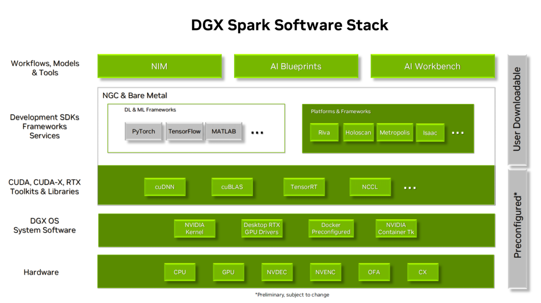 DGX Spark 出厂预装 NVIDIA DGX OS,内置 NIM 推理引擎、各类深度学习框架及预训练模型 [4],开发者开箱即可进行模型的原型设计、微调推理,数据科学研究以及边缘应用开发工作。