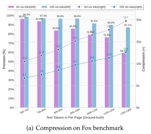 该技术创新性地将文档视为完整图像,通过视觉 token 进行压缩。实验数据显示,在 10 倍压缩比下,64 vis toks 仍保持近 97% 的还原准确率,这对于许多应用场景无疑是极具吸引力的。[1,2]