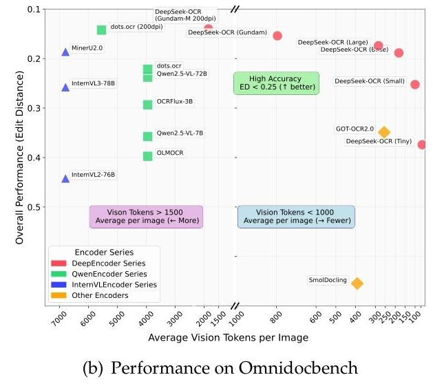 此外,对比 Qwen(绿色方块)、InternVL(蓝色三角)等动辄数千个视觉 Token 才能达到相近精度,DeepSeek OCR 系列模式(红色圆点)仅用十分之一甚至更少的视觉 Token,就实现了更高精度,验证了其“光学上下文压缩技术”在效率和精度上的双重突破。