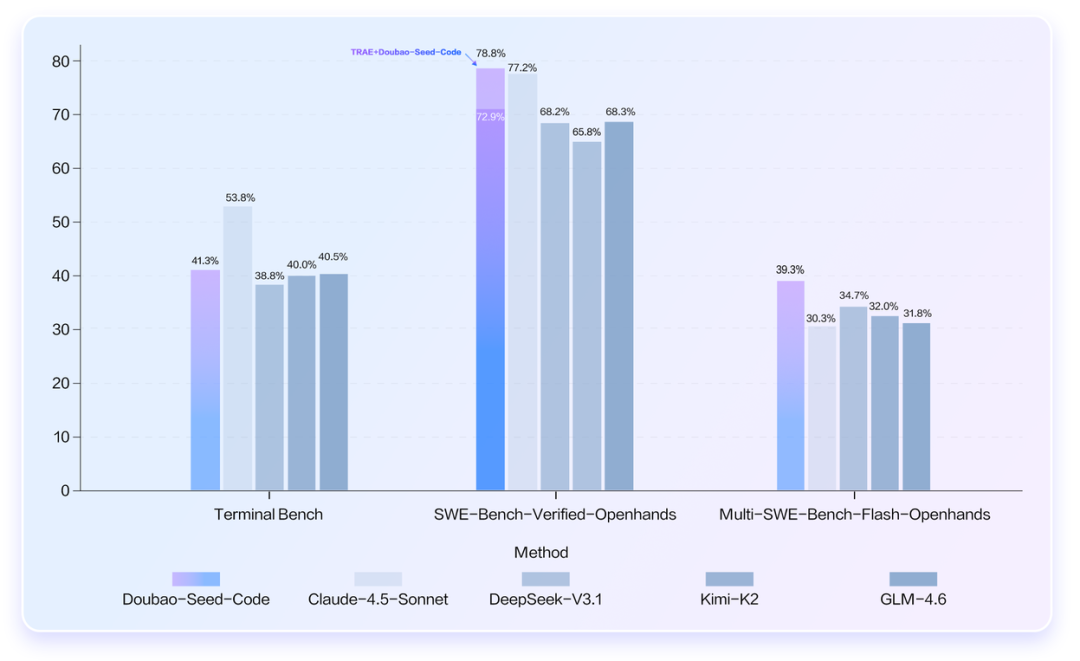 据悉,Doubao-Seed-Code 依托大规模 Agent 强化学习系统,涵盖十万容器镜像数据集,支持万级并发与上千卡 RL 高效训练,无需冷启动数据,通过端到端训练实现顶尖的 Agent 编程能力。其以最高 78.80% 的得分刷新 SWE-Bench-Verified 榜单 SOTA,Terminal Bench 等测试领先国内竞品。