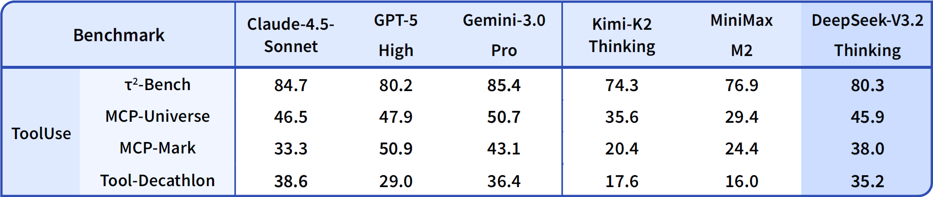 作为 DeepSeek 首款 “思考 + 工具” 深度融合的模型,V3.2 可在思考过程中动态调用工具,根据返回结果反思优化方案(如代码调试、数据计算),其在 T2-Bench 工具调用评测中拿下 80.3 分,开源模型中排名领先,复杂编程、自动化运维场景效率翻倍。