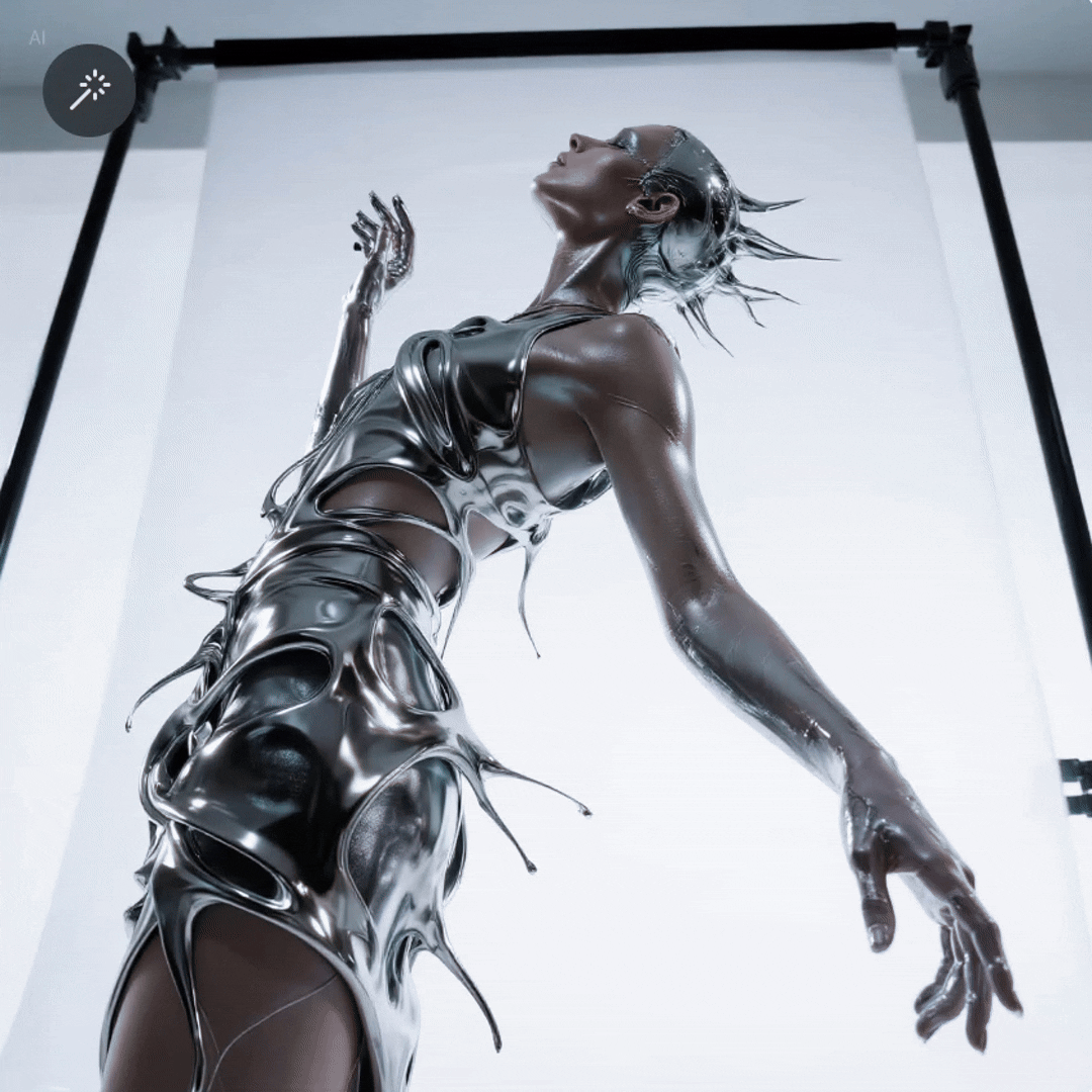 提示词:保持模特的姿势和流动的裙摆形状不变。将衣物材质从银色金属换成完全透明的清水(或玻璃)。通过液态水,模型的皮肤细节清晰可见。光线从反射变为折射。