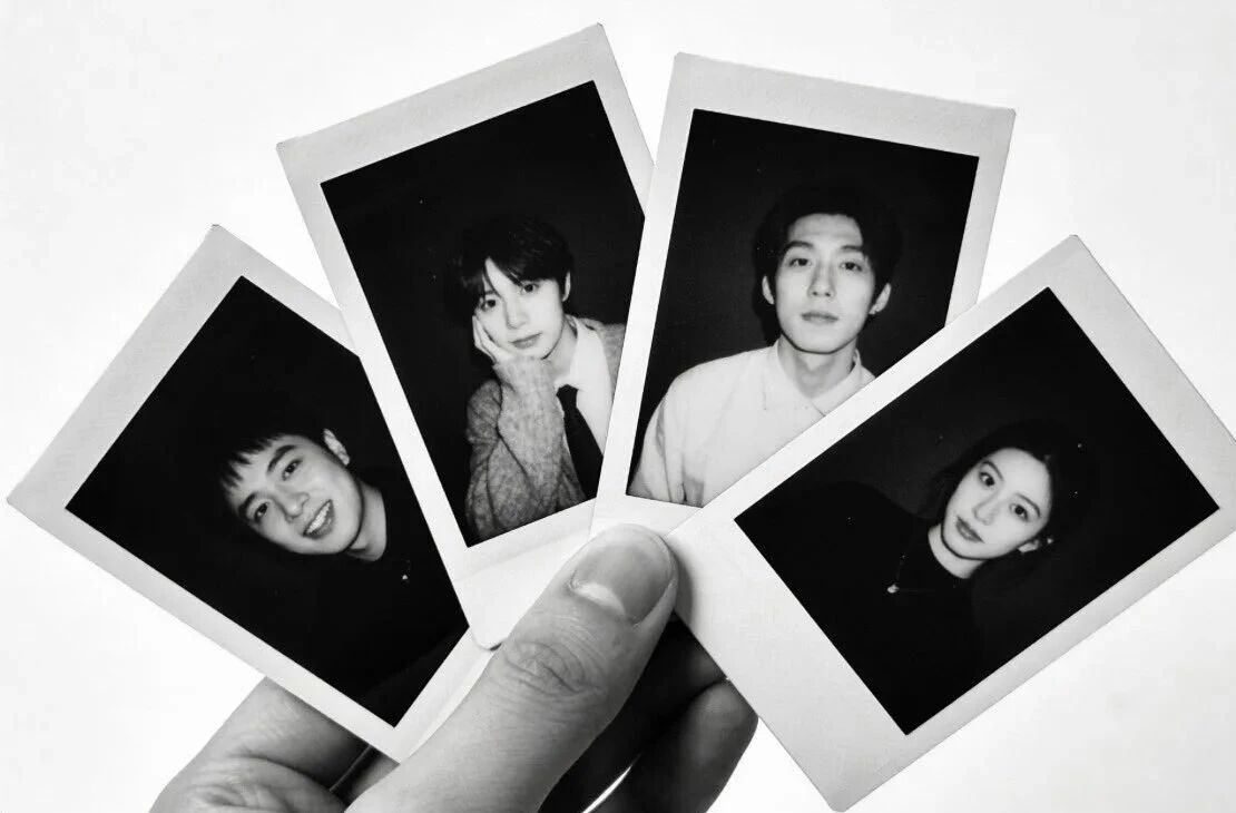 提示词:一只手握着四张黑白宝丽来风格的肖像照片,背景是空白的白色。