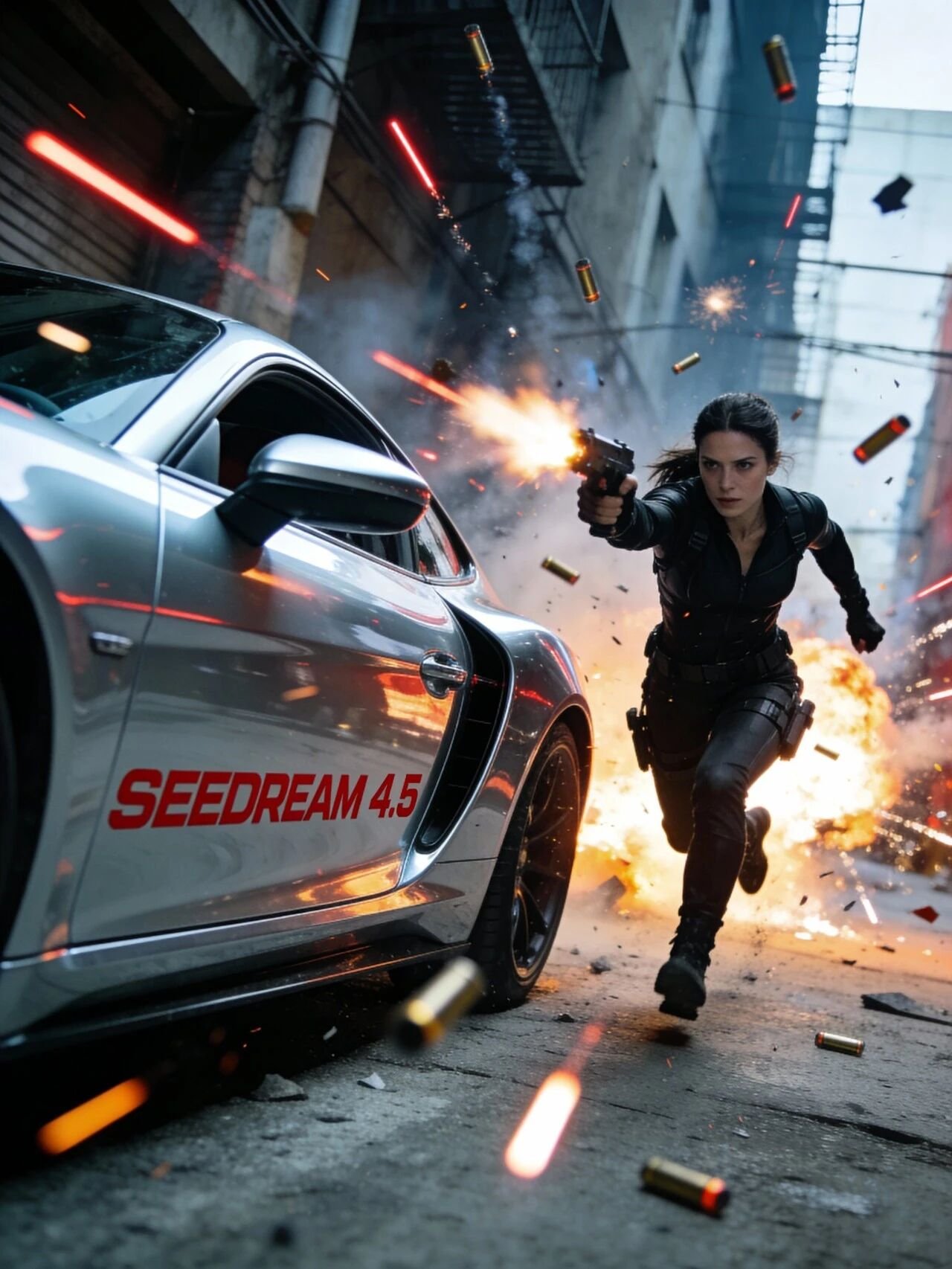 提示词:一部激烈动作片截图:一名女间谍在躲避枪火,飞奔到她那辆写着“SEEDREAM 4.5”的流线跑车旁。