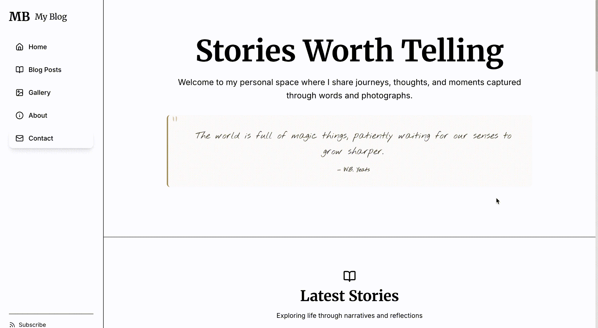 示例:创建一个个人博客,背景为奶油色,深灰色衬线字头,引用块用手写字体,网格布局照片画廊,简约侧边栏导航,顶部有阅读进度条指示器。