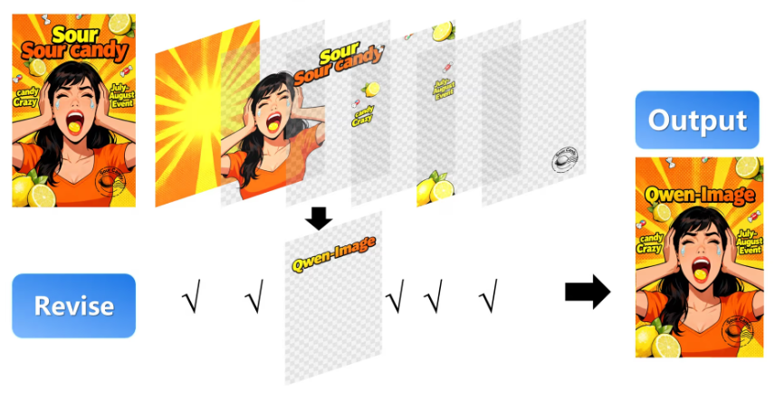 选择指定图层文本,即可修改内容。如把图层 3 中的英文“Sour Sour candy”改成“Qwen-Image”: