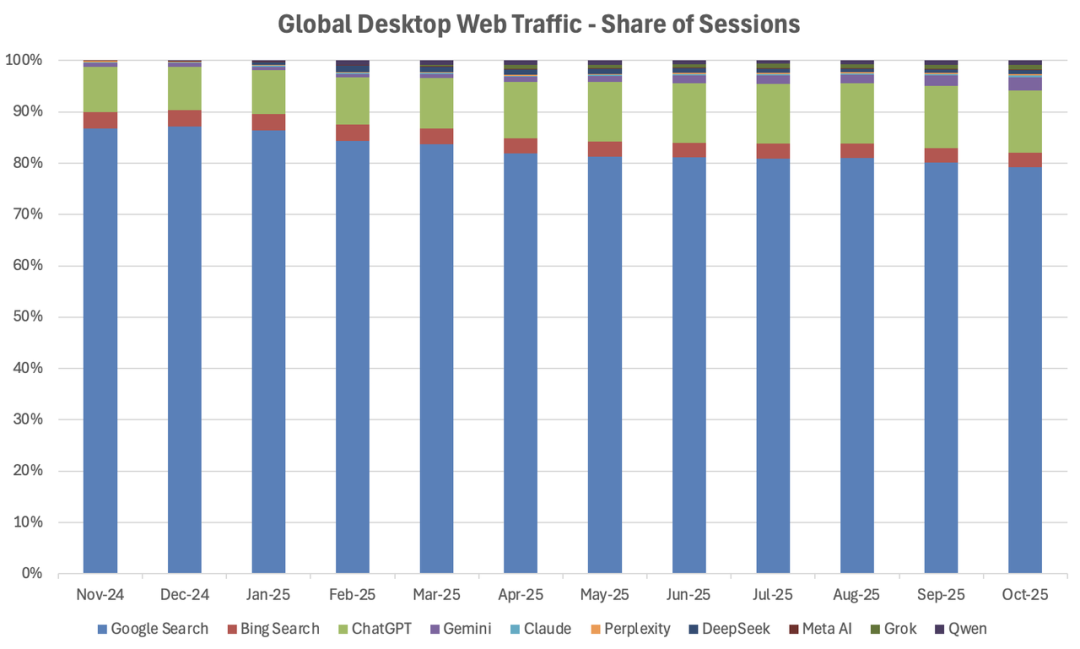 2025 年已经过去,Chatbot 经过几年的发展已经改变了我们的生活工作,它擅长即时响应,提供比搜索引擎更直接的答案。正如 Similarweb 数据展示,Google 之外的 Chatbot 访问流量已不可忽视。