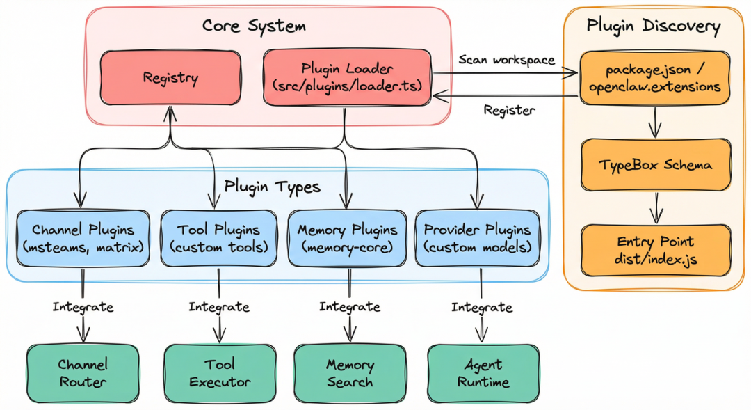 OpenClaw 的核心模块包含:会话管理、记忆存储、工具沙箱、访问控制和任务编排。智能由模型来提供,OpenClaw 则提供环境。其采用 Hub-and-Spoke 架构,以一个 Gateway 作为Hub,连接用户输入端(iMessage、Slack、WebChat、CLI,微信,飞书等)与 Agent: