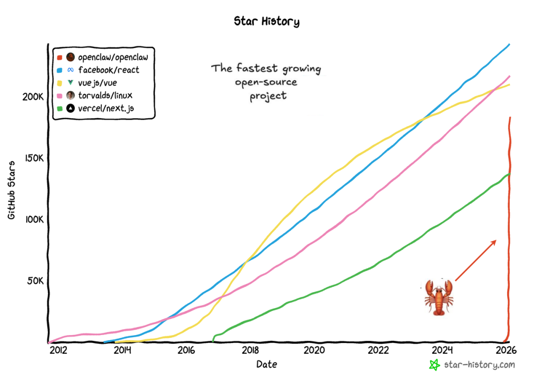在元宝派内测前夕,AI 智能体工具 OpenClaw(原名 Clawdbot / Moltbot)在海外迎来现象级爆发,短短 2 周内狂揽 GitHub 18.1 万颗星!