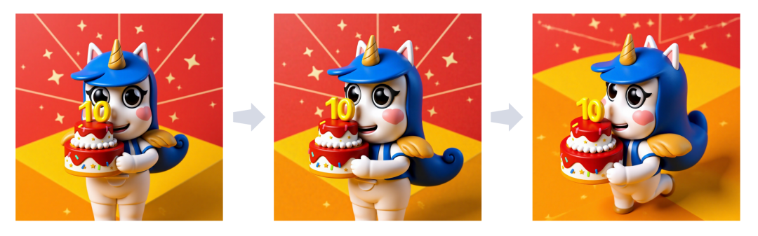 不同角度提示词:Rotate the camera [任意角度] degrees clockwise, keep the cartoon character in the frame.