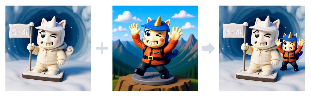 多图融合提示词:place the cartoon character from [图片1] into the background of the cartoon character from [图片2] , and have it stand behind the latter.