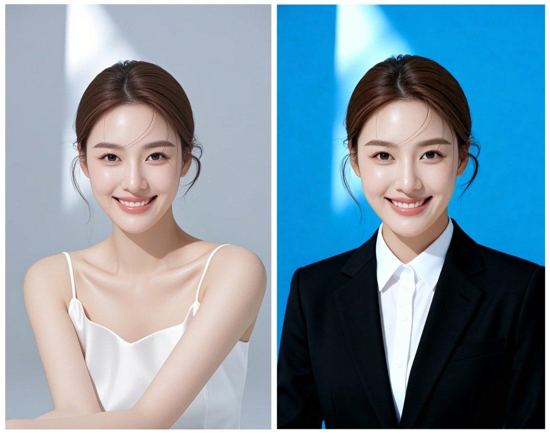 提示词:将图片1中的人物形象修改为蓝底证件照,人物穿上白色衬衫,黑色西装