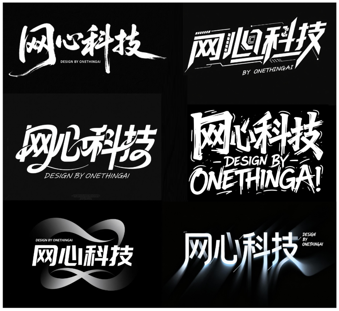 提示词:把文字“网心科技”,英文手写体“DESIGN BY ONETHINGAI”换成 **** 字体,黑底白字