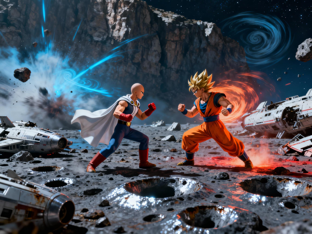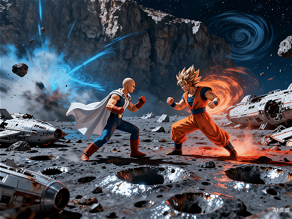 提示词:两人同时挥拳猛烈相撞并持续 3 秒,瞬间掀起强烈气流与能量波动、致衣角飞舞及地面震裂,随后战斗全面爆发,二人以迅猛连续的动作拳脚交织,镜头在拳头碰撞瞬间剧烈震动后稍作后仰,再快速切入近身搏斗并以手持感跟随两人移动、左右摆动增强冲击感,背景设定为月球地表(周围有飞船残骸、地表裂痕,远处岩壁模糊晃动,空气残留气流扰动和能量光痕),画面采用写实电影质感。