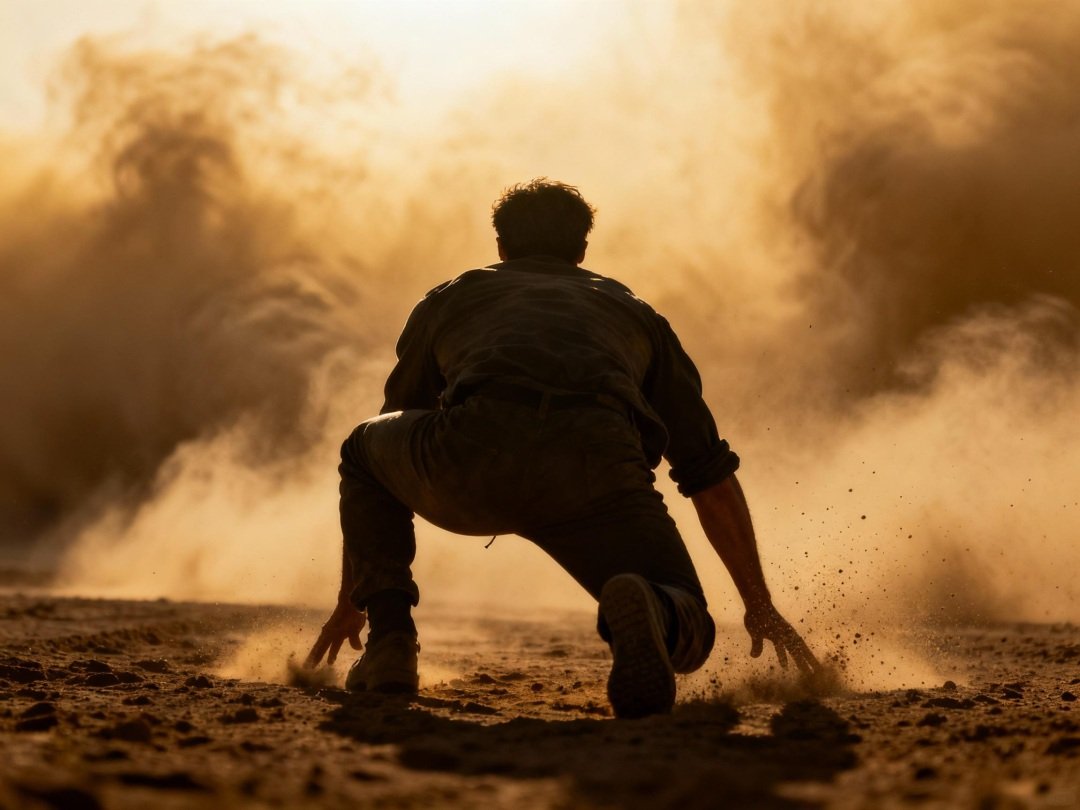 提示词:在沙漠中,男人从地面蓄力后猛然冲向沙尘暴,最后被沙尘暴吞没,镜头紧贴背后跟随,高速运动中出现轻微拖影与尺度变化,增强真实感。接着转场,夜幕降临,周围一片寂静,一只手从沙漠上伸出来。写实电影质感,真实反射与体积雾;动作流畅,速度曲线明显,整体紧张刺激与沉浸感强。