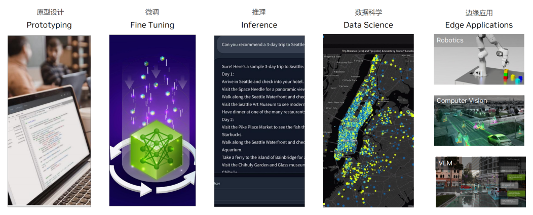 DGX Spark 出厂预装 NVIDIA DGX OS,内置 NIM 推理引擎、各类深度学习框架及预训练模型 [4],开发者开箱即可进行模型的原型设计、微调推理,数据科学研究以及边缘应用开发工作。