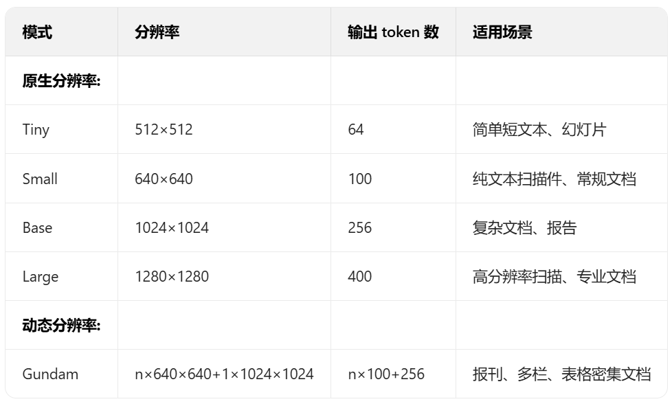 为了满足不同视觉 token 数量下的解码需求,DeepSeek-OCR 基于动态插值位置编码和多分辨率模式训练,使 DeepEncoder支持原生分辨率 Tiny、Small、Base、Large 及动态分辨率Gundam 等超高清模式的适配。