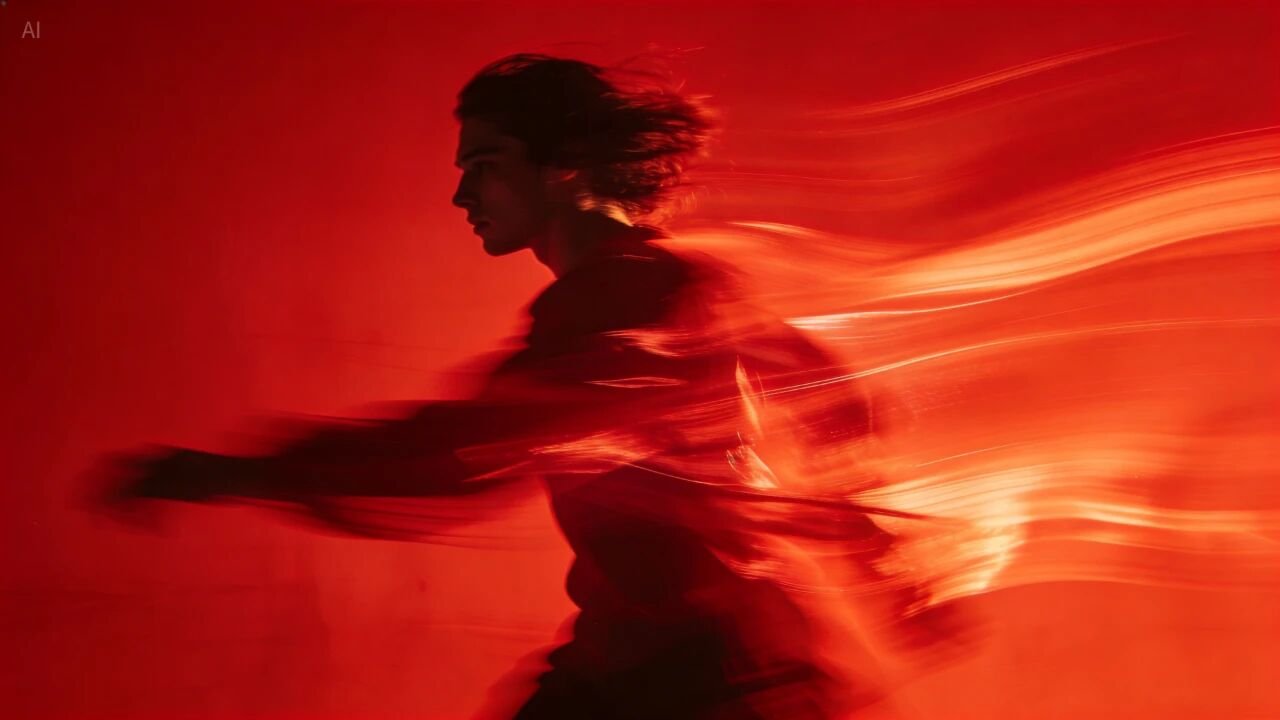 提示词:动态动态肖像,一张动态长曝光的镜头,拍摄人物在鲜艳的红色背景下运动,营造出流畅且富有艺术感的视觉效果。
