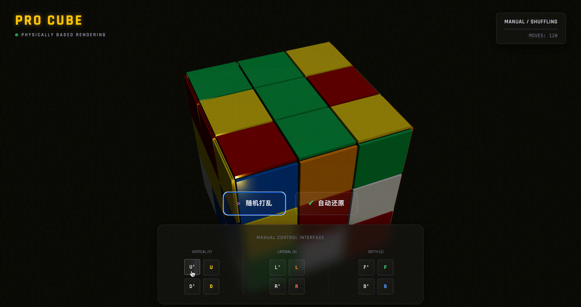 示例:构建一个3d纹理的rubix立方体,有一个按钮可以洗牌立方体,另一个按钮可自动解决谜题。此外,提供允许用户使用多个按钮手动求解多维数据集的控件。立方体还应支持放大和缩小。
