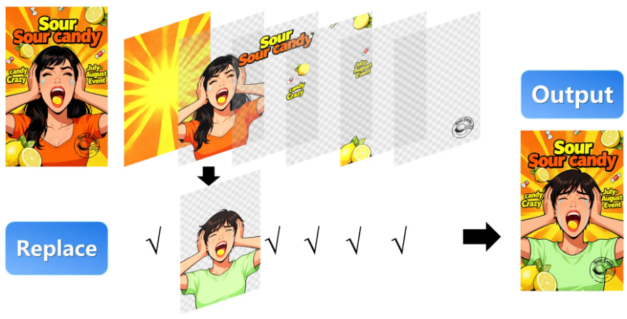 替换特定图层对象内容,如把图层 2 中“身着橙色上衣的长发人物”改成“身着绿色上衣的短发人物”,同时不影响其他图层: