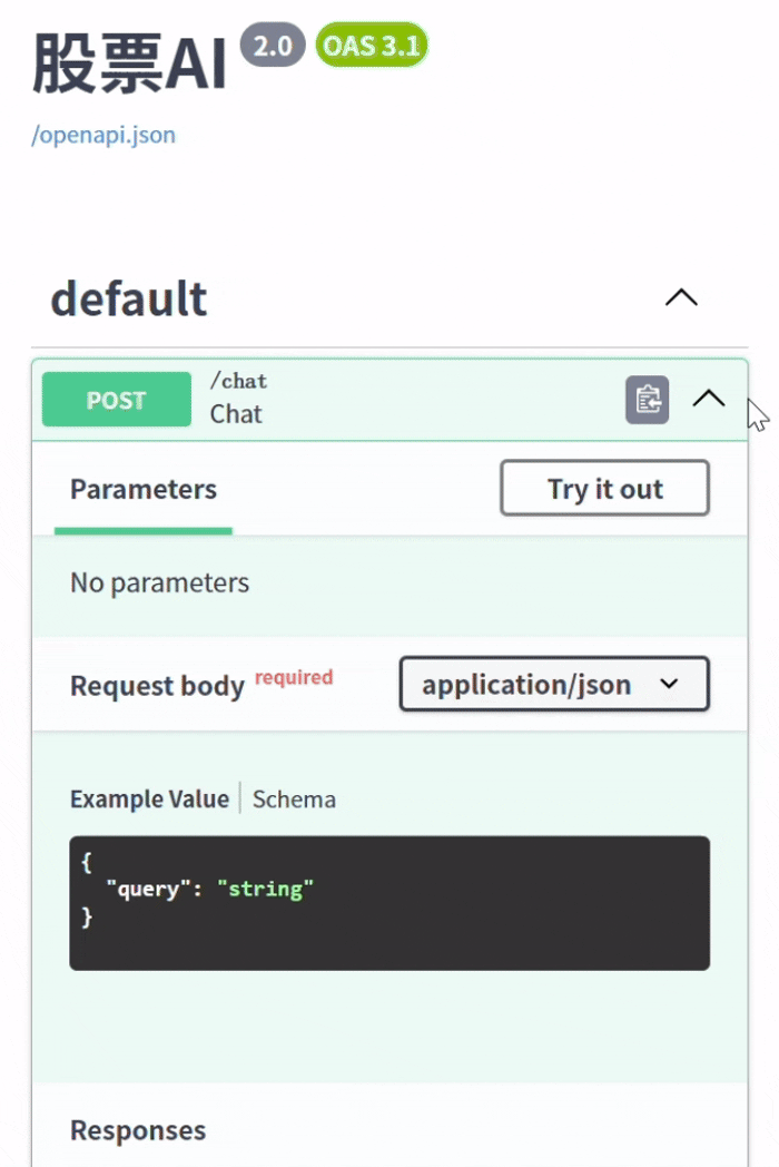 pyenv install 3.10.0pyenv local 3.10.0python -m venv venvsource venv/bin/activatepip install langchain langchain_core langchain_openai dotenv pydantic uvicorn fastapi 以上代码启动后即可通过访问本地 3000 端口,实现股票的分析: