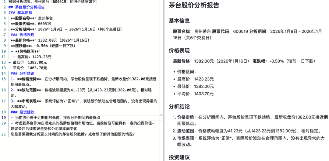 Agent 返回的 Markdown 渲染效果如下: