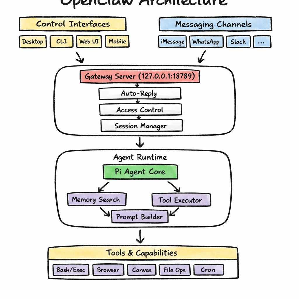 OpenClaw 的核心模块包含:会话管理、记忆存储、工具沙箱、访问控制和任务编排。智能由模型来提供,OpenClaw 则提供环境。其采用 Hub-and-Spoke 架构,以一个 Gateway 作为Hub,连接用户输入端(iMessage、Slack、WebChat、CLI,微信,飞书等)与 Agent: